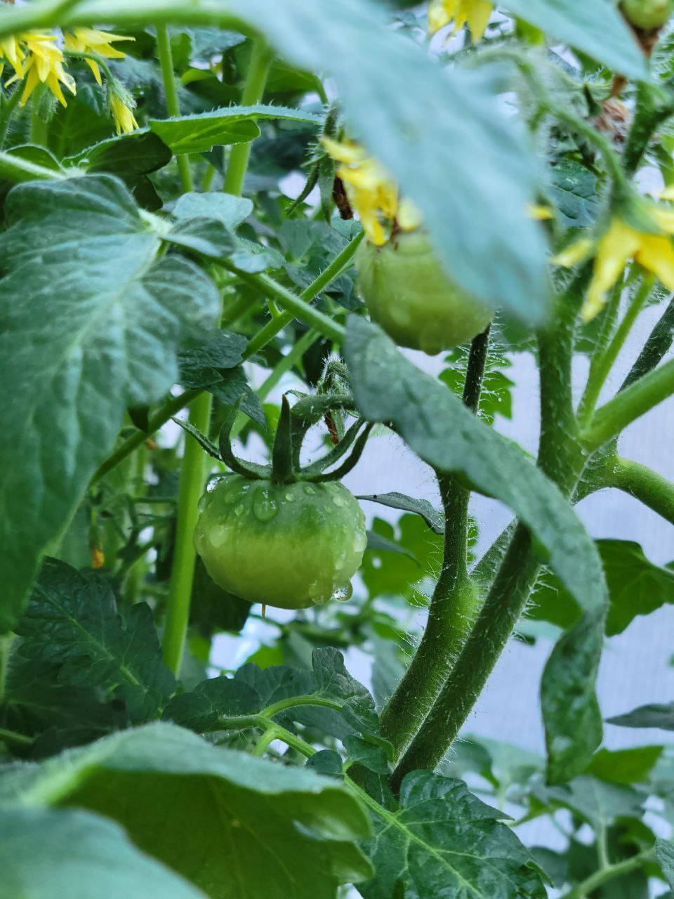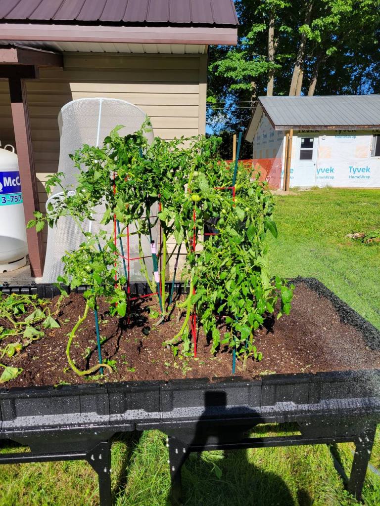 Tomatoes grow tall and they really need a supportive trellis at the beginning while they fortify their stem strength. We purchased some gardening wire and used that to “tie” them to the trellis to help out and then removed them as the plants thrived.