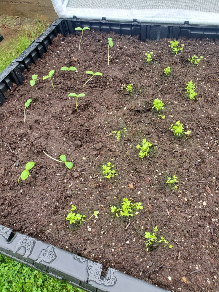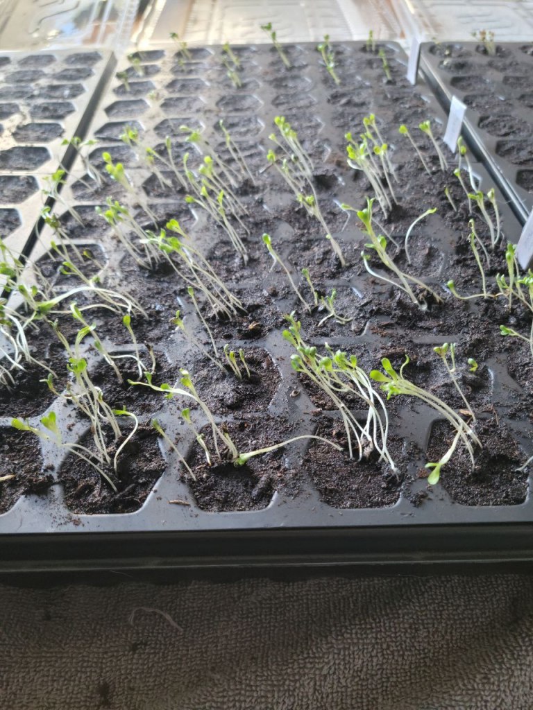 You would think that these leafy greens would need a lot of water. At least, we did! We were so excited when they sprouted immediately… But they didn’t stop growing. They became super whispy and tall and unfortunately there was no redeeming them into the stockier plants that they should have been. We were using a self-watering tray. Next year we will likely just start these a bit later directly in the garden bed and water daily as needed.