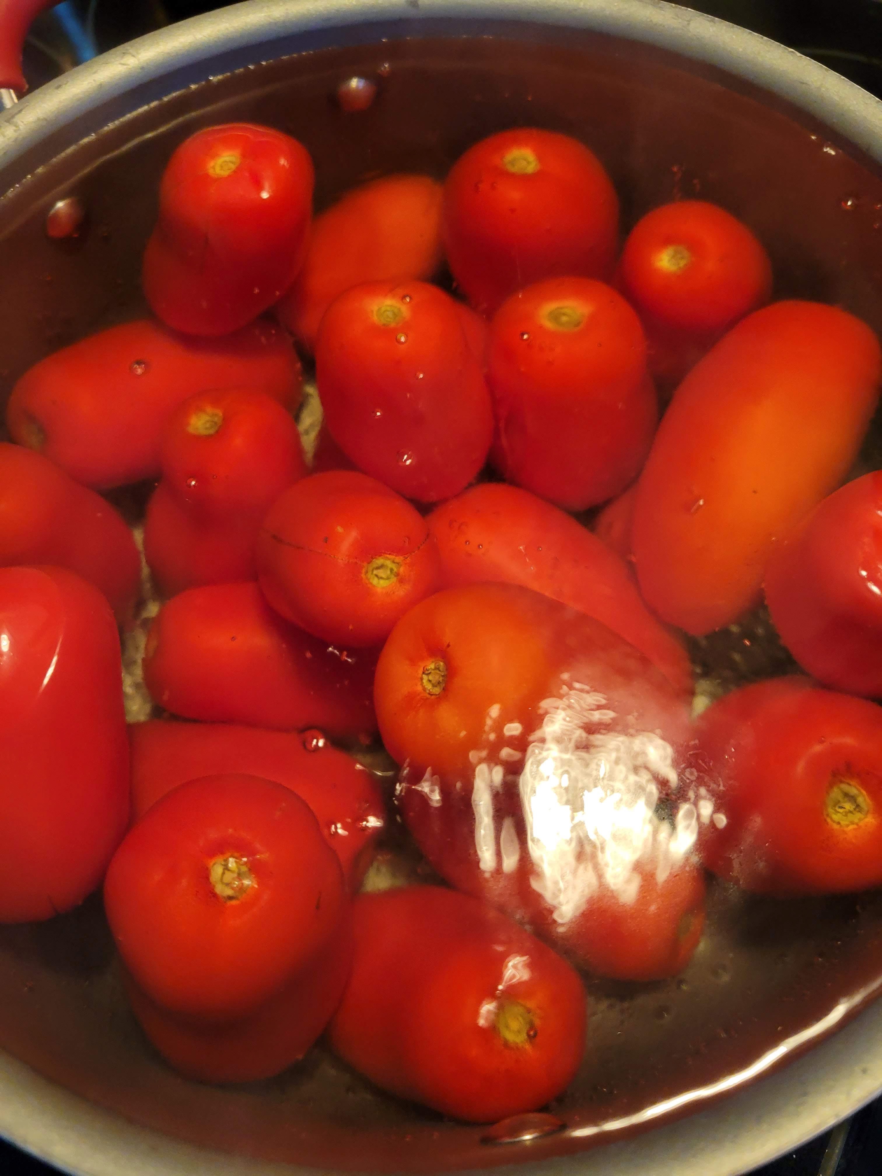 Prepare the tomatoes for boiling by scoring the bottoms of them in an X pattern